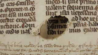 Augud võivad tekkida pärgamendi valmistamise kõigis etappides. Lahti rebenenud, algselt kinni nõelutud auk, pärgamendis.