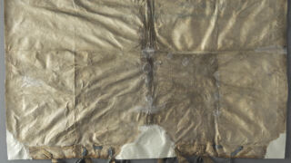 As a result of several damages, the parchment is severely degraded and as a result, the urin is severely deformed over the entire surface as a result of local shrinkage.