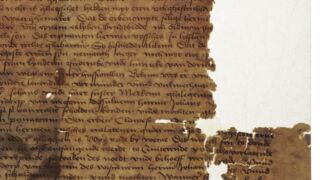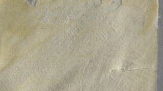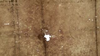 Bioloogilise kahjustuse tulemusena auklikuks muutunud pärgament kaldvalguses.